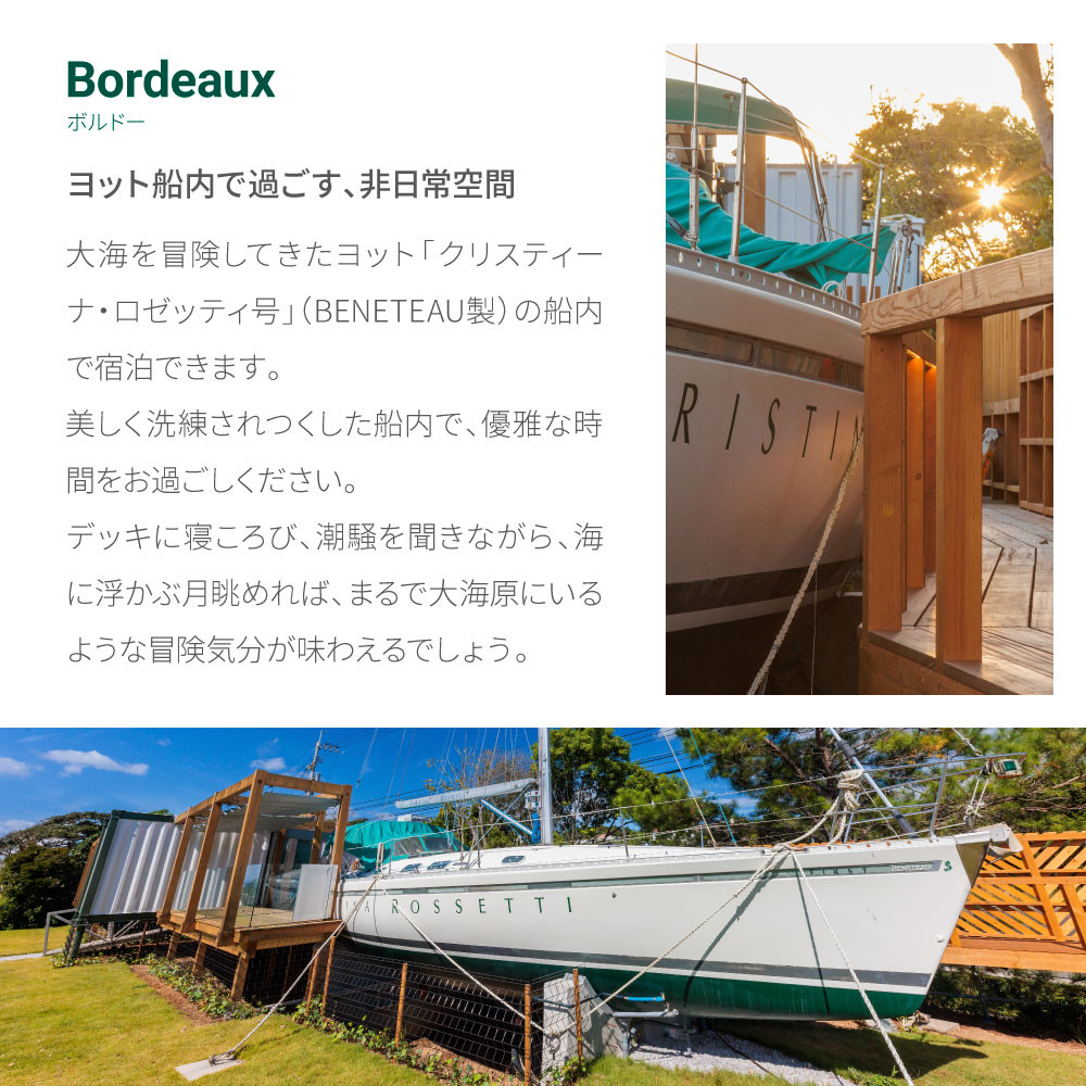 オーシャンビューの貸別荘、NAMI TERRACE GEISEIの宿泊に使える割引チケットです。大人の遊び場をイメージした全4棟の客室はそれぞれ個性あふれる作りとなっています。2棟は海に開けたコンテナハウス。1棟は木造離れ。木造離れは丘の上にあり、プライベート感満載。屋外ジャグジー付きです。そしてもう1棟はなんと海を走っていたヨットを客室にしたものです!ゴージャスな船室はまさに非日常の空間です。さらに客室以外の施設として日本でここしかない建設用3Dプリンタで外壁を印刷したサウナがあります。芸西村にある珍しい地層「メランジュ」をイメージした自慢のサウナです。
