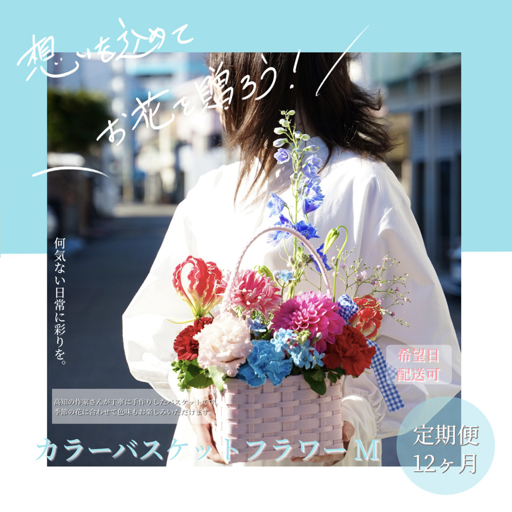 大切な方への贈り物、ご自宅用として「花のある暮らし」をはじめませんか? 《12ヵ月定期便》季節の生花カラーバスケットフラワーM カラーバスケット 紙バンドバスケット フラワーバスケット 季節 手作り ブルースター トルコギキョウ お取り寄せ 生花 プレゼント 贈り物