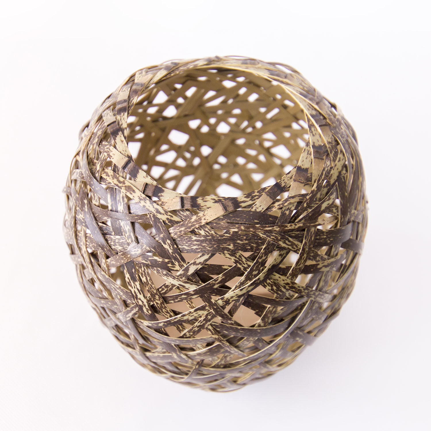 虎斑竹の重厚なこげ茶色の紋様は自然の色ですので変わることはありません 0160106 竹細工 花器 ~蓑篭(小)・虎斑竹~