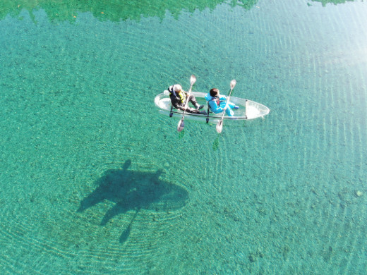 透明のクリスタルカヤックで水と一体化。 ”奇跡の透明度”仁淀ブルーを水上散歩♪ 仁淀ブルー最上流エリアでクリスタルカヤック体験&ドローン撮影!