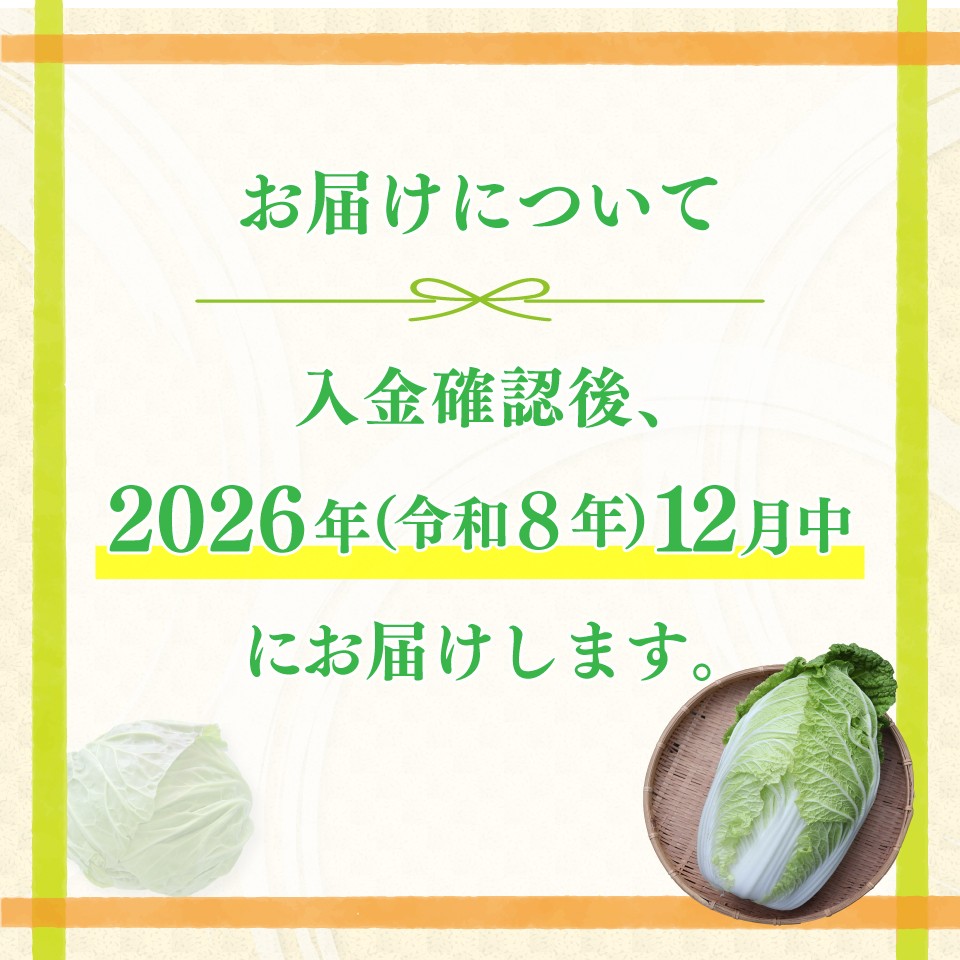 | 容量 | 白菜:1株(約2.5kg) キャベツ:2玉(約2kg) ※サイズが不揃いのものが入る場合がございます |