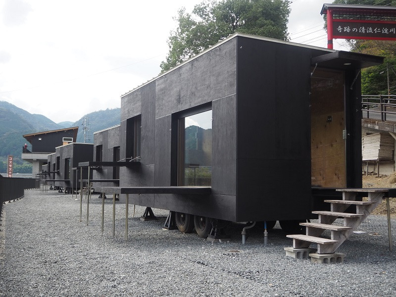 ・『スノーピークかわの駅おち』のモバイルハウス「住箱-JYUBAKO-」はスペースの関連上、荷下ろしの際に車をお部屋に横付けできません。駐車場からお部屋までは徒歩で3分ほどございます。予めご了承ください。