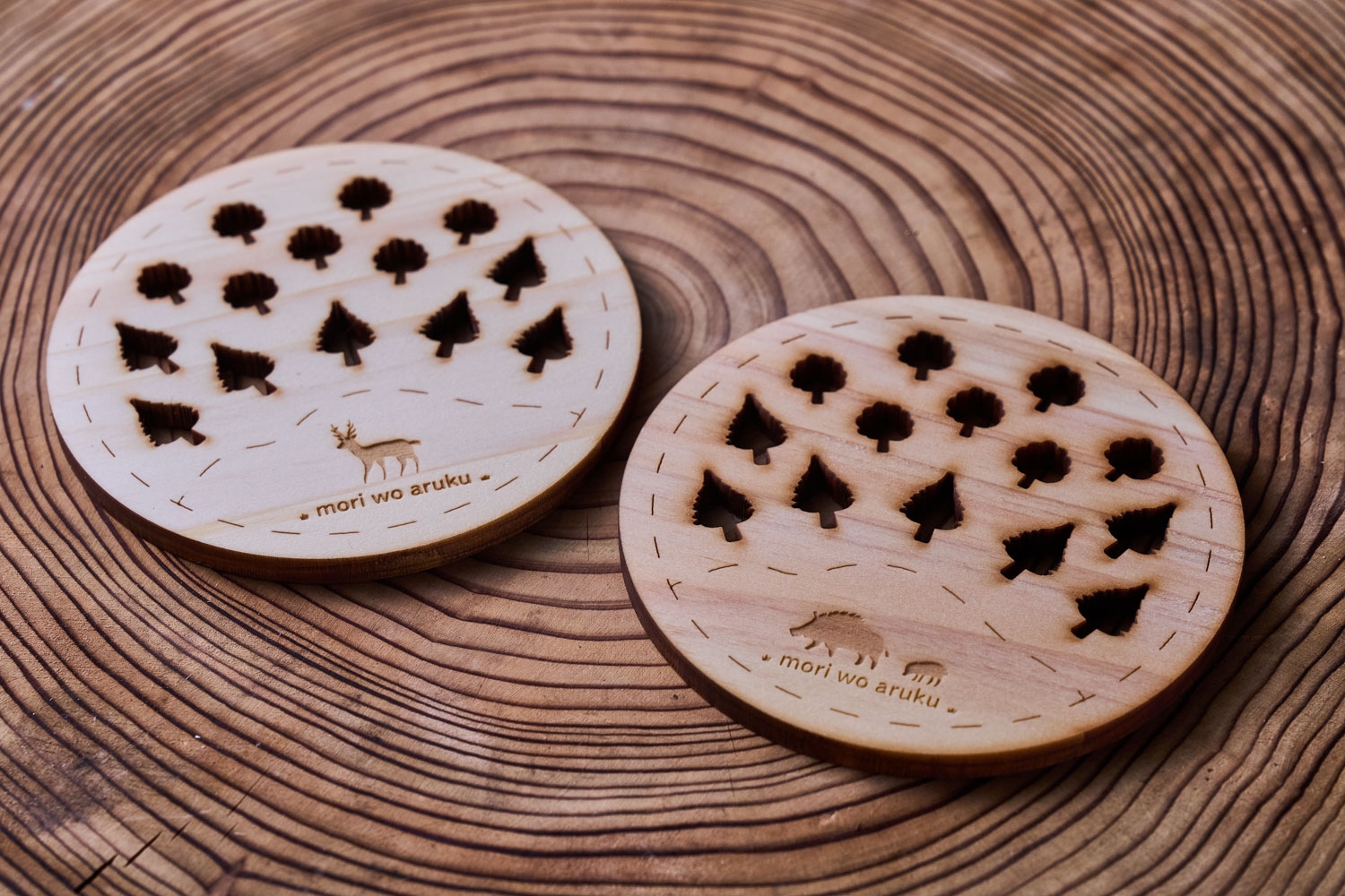 梼原産ヒノキ無垢材で作られた木製コースターの4枚組セットです。針葉樹と広葉樹が生い茂る森に動物たち(いのしし&しか)が遊びに来ている様子をデザインにあしらった、ほっこり可愛いコースターです。厚み5mmのしっかりとした造りで、グラスを優しく受け止め水滴を吸収します。天然木ならではの香りと木目模様が楽しめ、ティータイムやコーヒーブレイクに癒しのひとときを演出します。来客用としてテーブルに並べれば、お客様との会話も弾むことでしょう。使わないときはインテリアとして飾っても絵になる、実用性とデザイン性を兼ね備えたアイテムです。4枚セットなのでご家族や来客用に十分な枚数があり、みんなで森の温もりを共有していただけます。