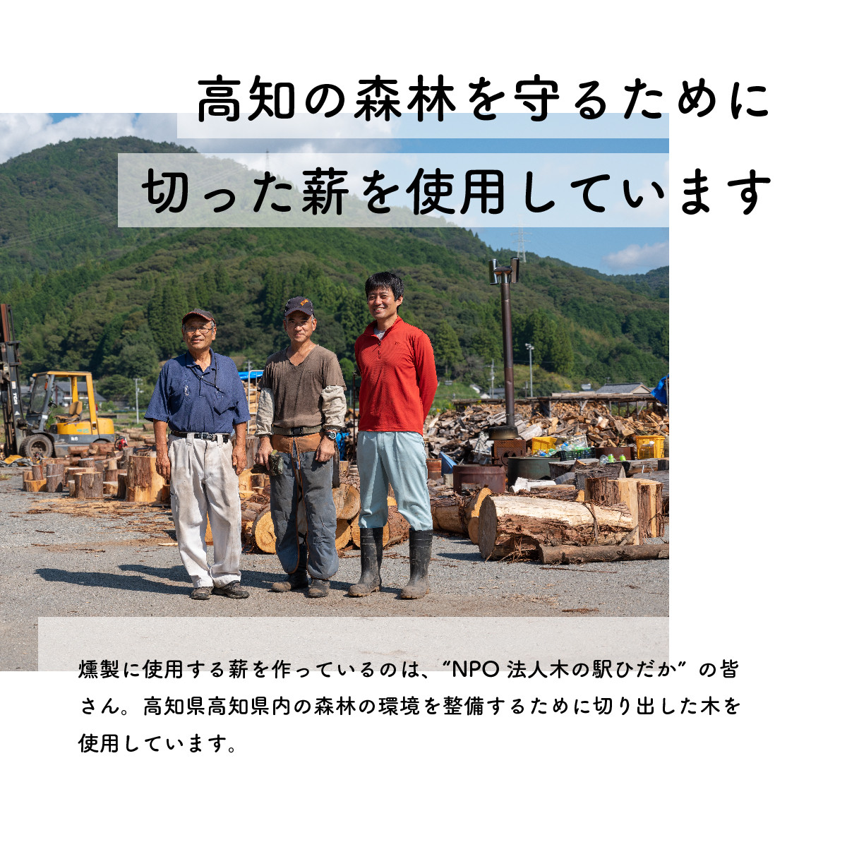 素材本来の味を引き出すため、塩と胡椒のみで味付けした無添加のハムやベーコンをはじめ、日高村や高知県産の食材を使った手作り品を提供しています。土佐あかうしを15時間以上かけて桜の薪で燻製にするなど、丁寧な調理と職人技が詰まっています。カフェでも提供している味を、ご家庭でも楽しめるのが魅力です。