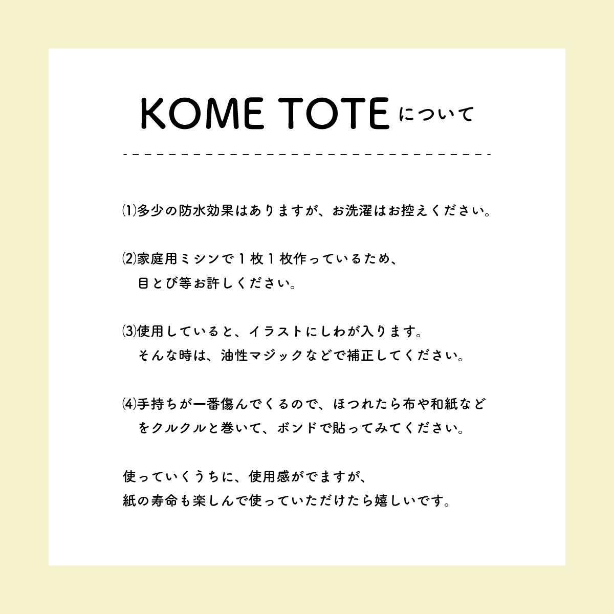 「KOME TOTE」は、再利用された米袋でできたトートバッグに、1点ずつにイラストを手描きしています。