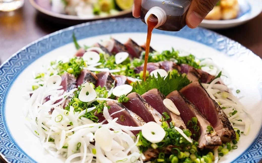 藤原鮮魚店オリジナルのパンチの効いたタレは、タタキの香ばしさと旨味をより一層引き立てます。
