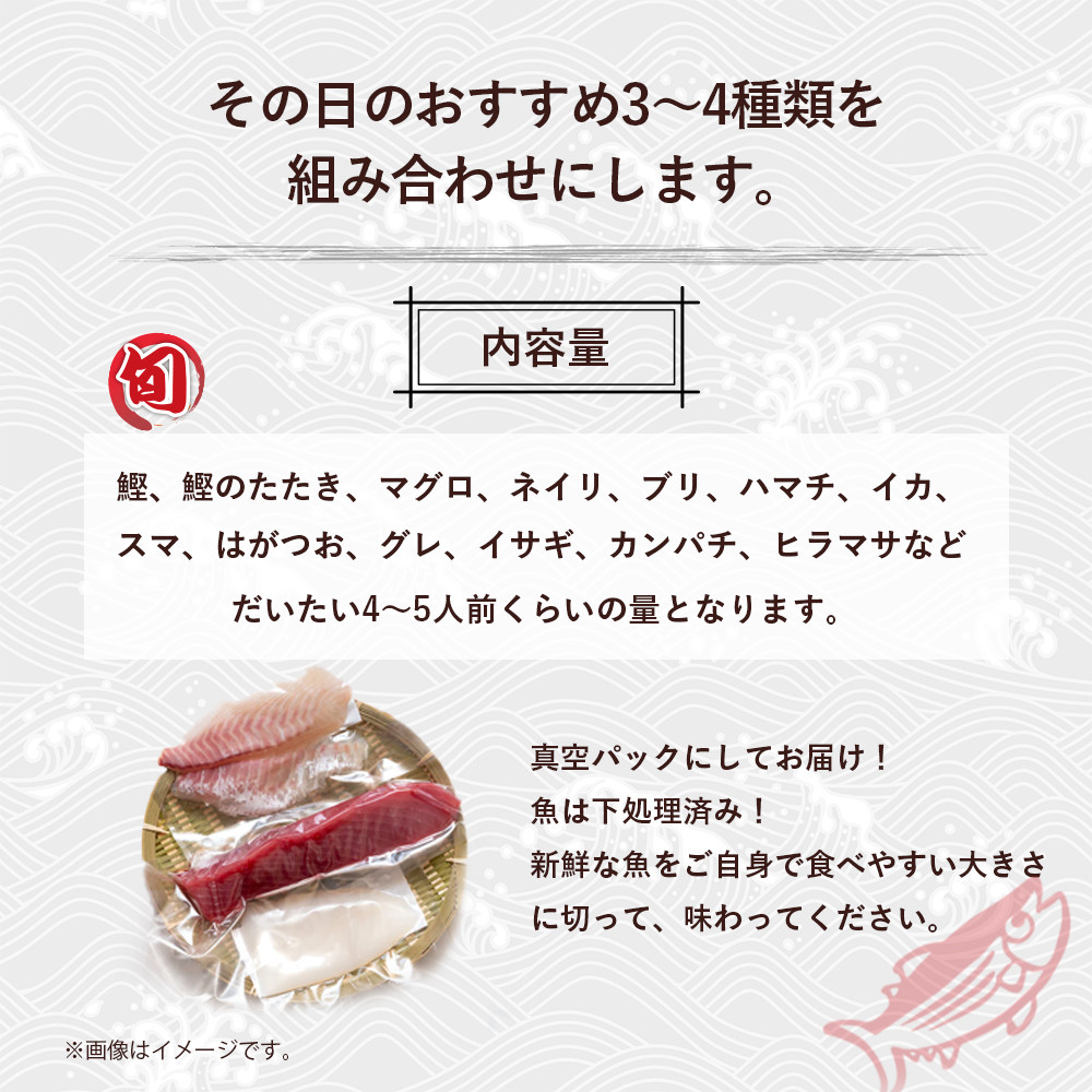 高知の旬の魚をサクにしてお届け! 旬な海の幸をお届け!大将のおまかせ刺身3~4種類盛! Efs-03 刺し身 海鮮 鮮魚 海鮮丼 魚 刺身セット お魚 さしみ 魚介類 刺身盛り合わせ 冷蔵 鰹 マグロ ブリ ハマチ イカ スマ グレ イサギ セット カンパチ ヒラマサ