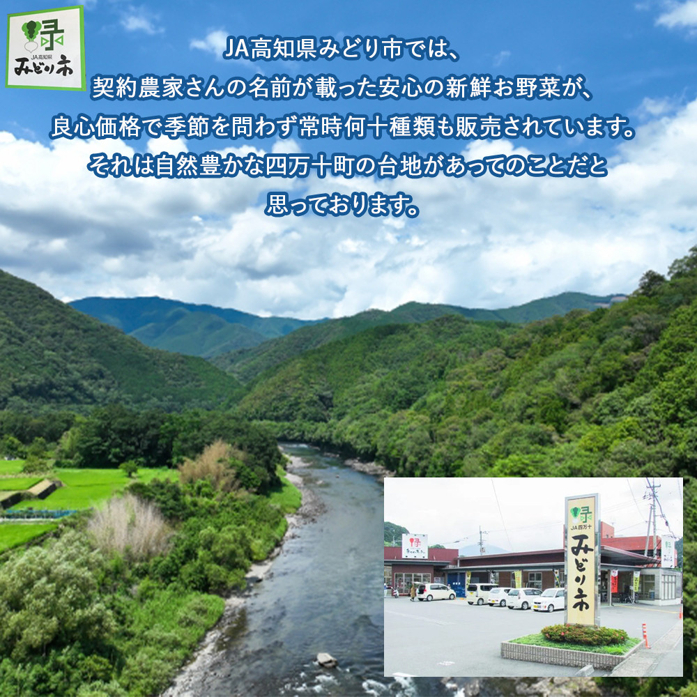 「みどり市」は、四万十町民のなくてはならない台所として、町民の毎日の食卓を彩り、安心安全のお野菜で健康を支えております。おいしい野菜を作っても、地元ではどうしても余ってしまう。高齢化や人口減少も進むなか、もっとたくさん作って県外に発送するという余力はない。田舎の小さな農家さんが抱える、大きな課題を解決するためにも私たちは地域一丸となって美味しいお野菜をお届けいたします