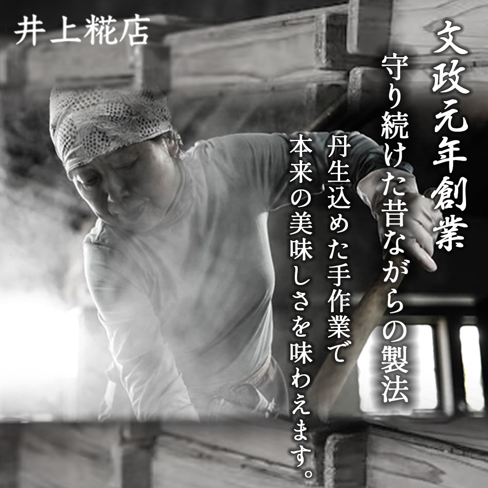 井上糀店の味噌(米味噌、麦味噌、合わせ味噌)は、手作りの糀と釜炊きの大豆、そして塩だけを使用して、加温せずちゃんと時間をかけて熟成させています。もちろん発酵止めもしていない生きたお味噌です。