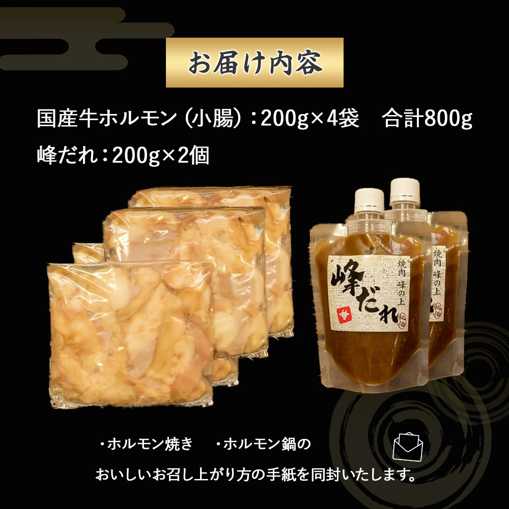 | 容量 | 国産牛ホルモン(小腸):200g×4袋 合計800g 峰だれ:200g×2個 |