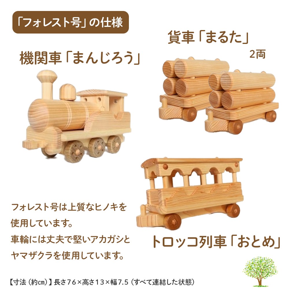 | 容量 | 木製機関車 1両 トロッコ客車 1両 丸太貨車 2両 (1両につき4本の丸太) 【使用材】 ヒノキ、ヤマザクラ、アカガシ (すべて四万十町産) 【寸法(約㎝)】 長さ76×高さ13×幅7.5 (すべて連結した状態) 【塗装】 荏胡麻オイル |