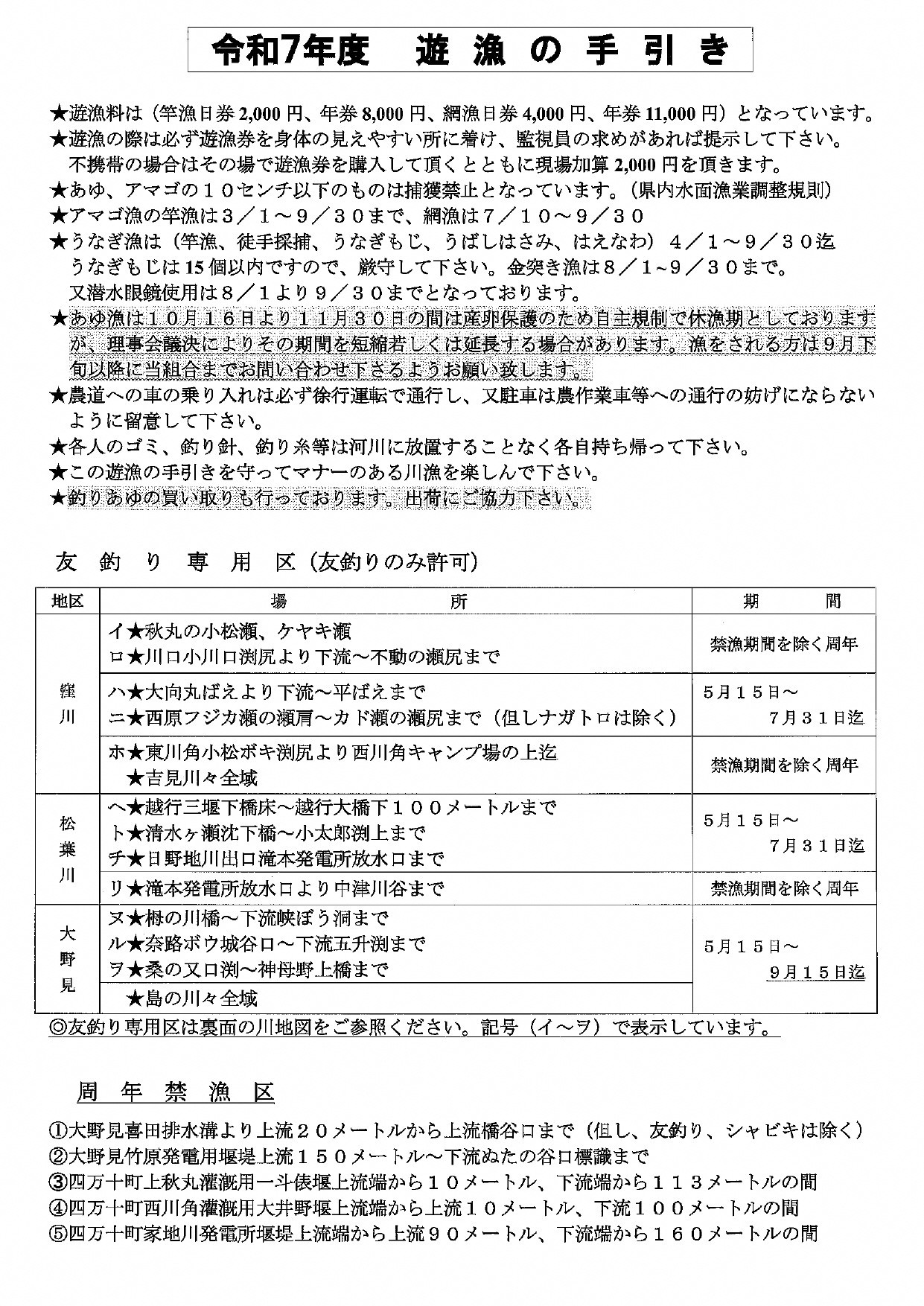 ※あゆ漁は10月16日より11月30日の間は産卵保護のため禁漁期となっておりますが、理事会決議によりその期間を短縮若しくは延長する場合があります。漁をされる方は9月下旬以降に当組合までお問い合わせ下さるようお願い致します。