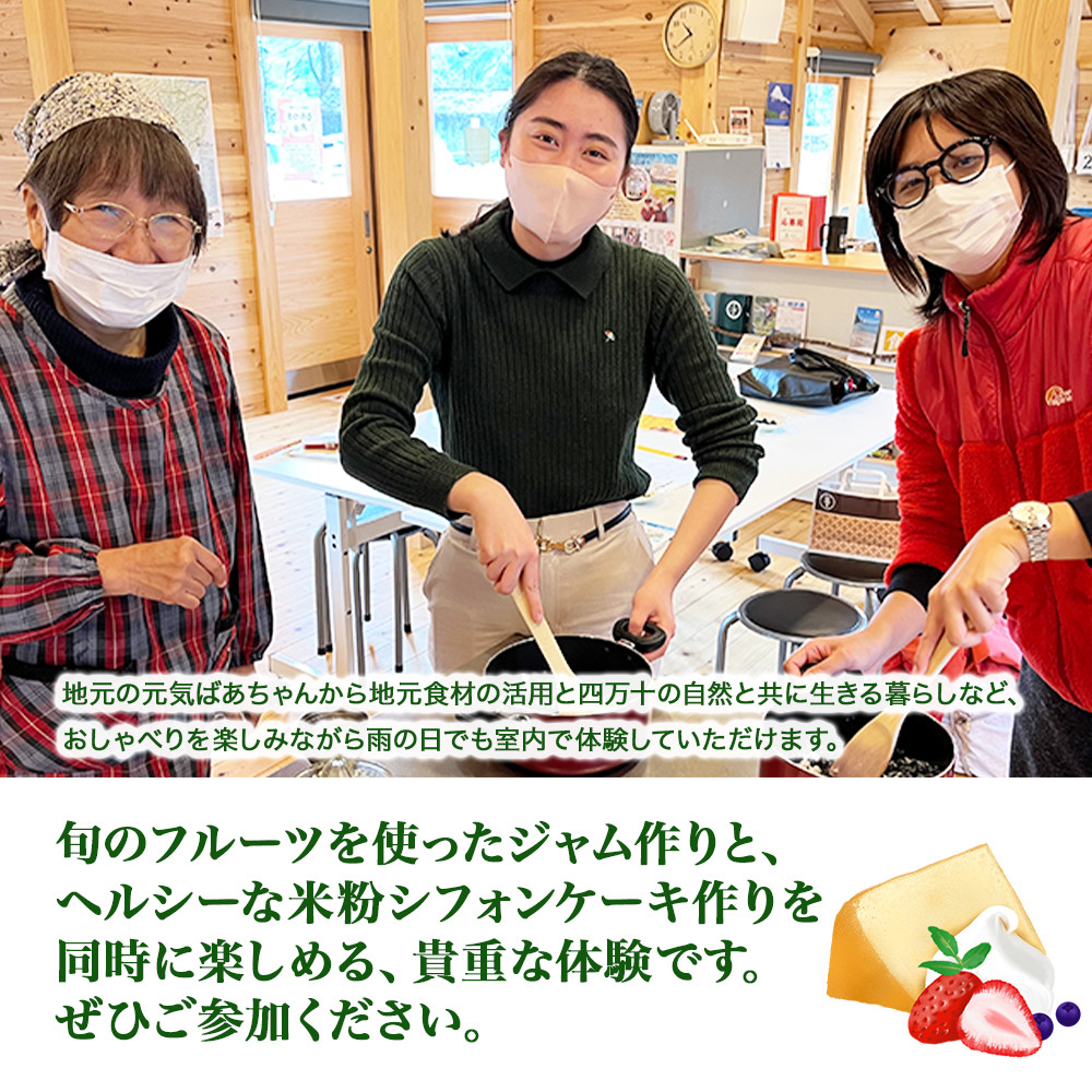 四万十の果実と米粉で作る 自然の恵みたっぷり!ご褒美スイーツづくり体験 四万十川の大自然で育った『季節の果物ジャムとオリジナルシフォンケーキづくり体験』2名利用券/1名追加につき+¥2,500+材料費(¥500位) Mkk-51 ケーキ作り ジャム作り 四万十 キャンプ 体験