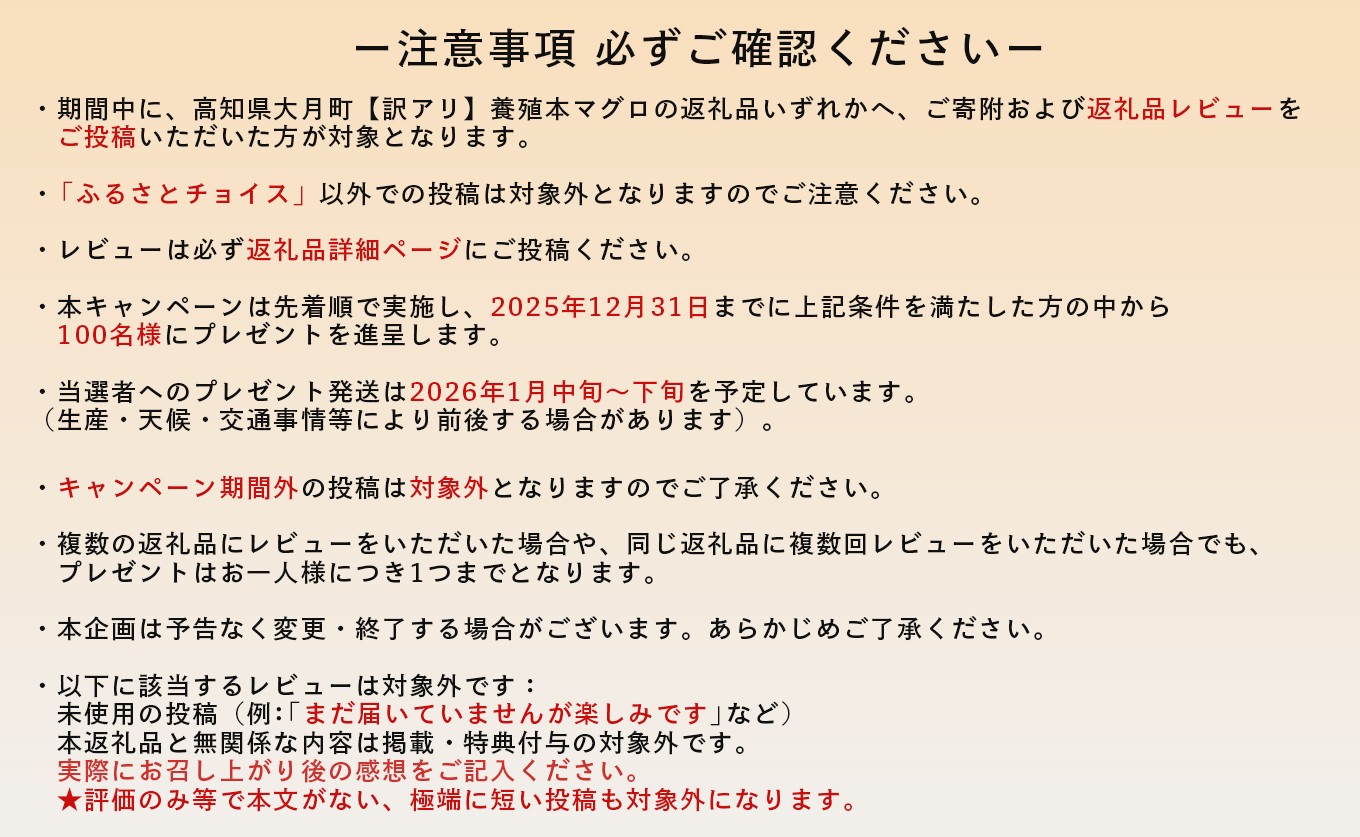 期間中、本品に対しお申込み&返礼品到着後レビューを投稿いただいたお客様の中から先着で100名様に「本マグロ赤身1柵」をプレゼント!