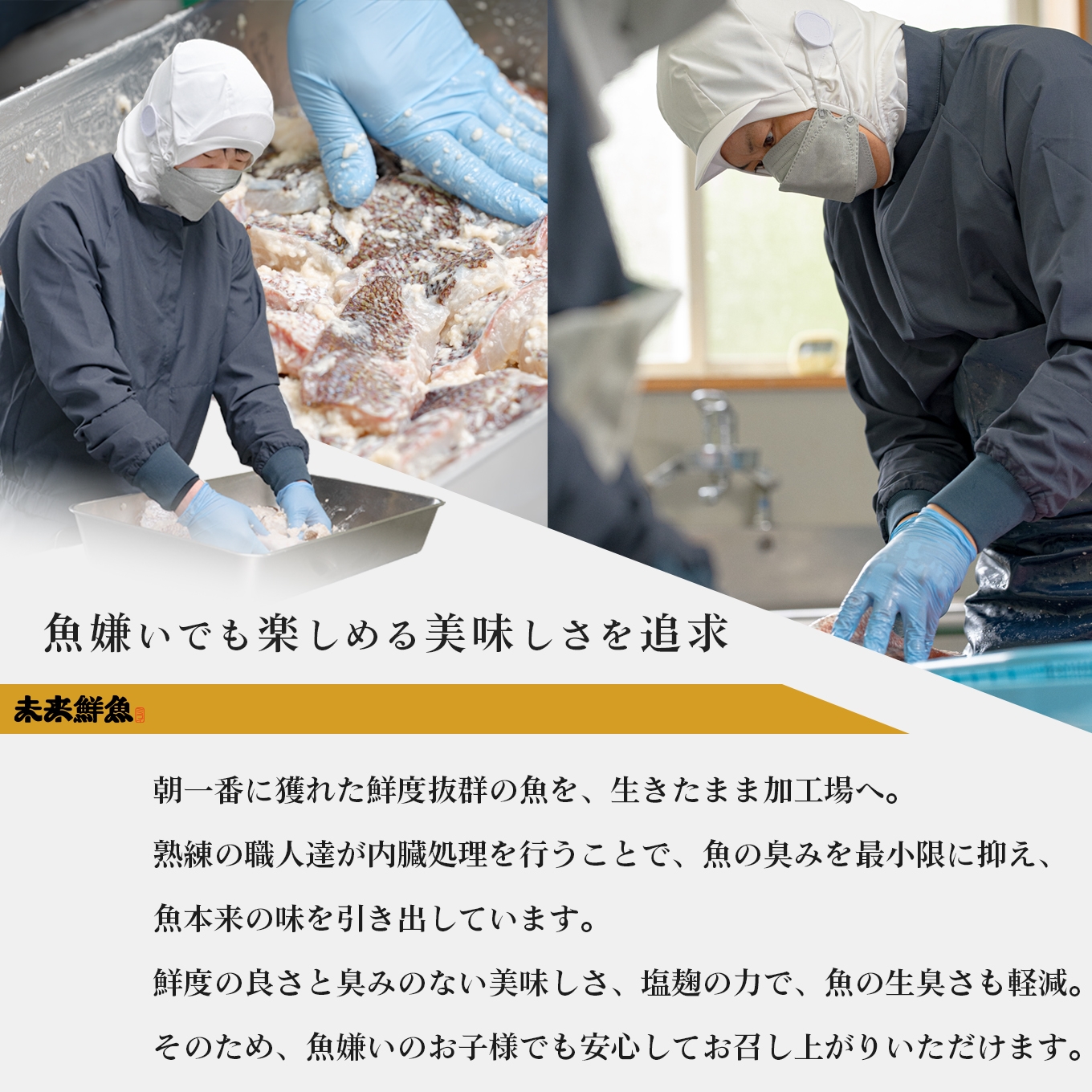 脂ののった鮮度抜群の魚をひとつひとつ手作業で下処理し、天日塩を使用したこだわりの塩麹に漬けこみ、深みのある風味豊かな味わいに仕上げました。