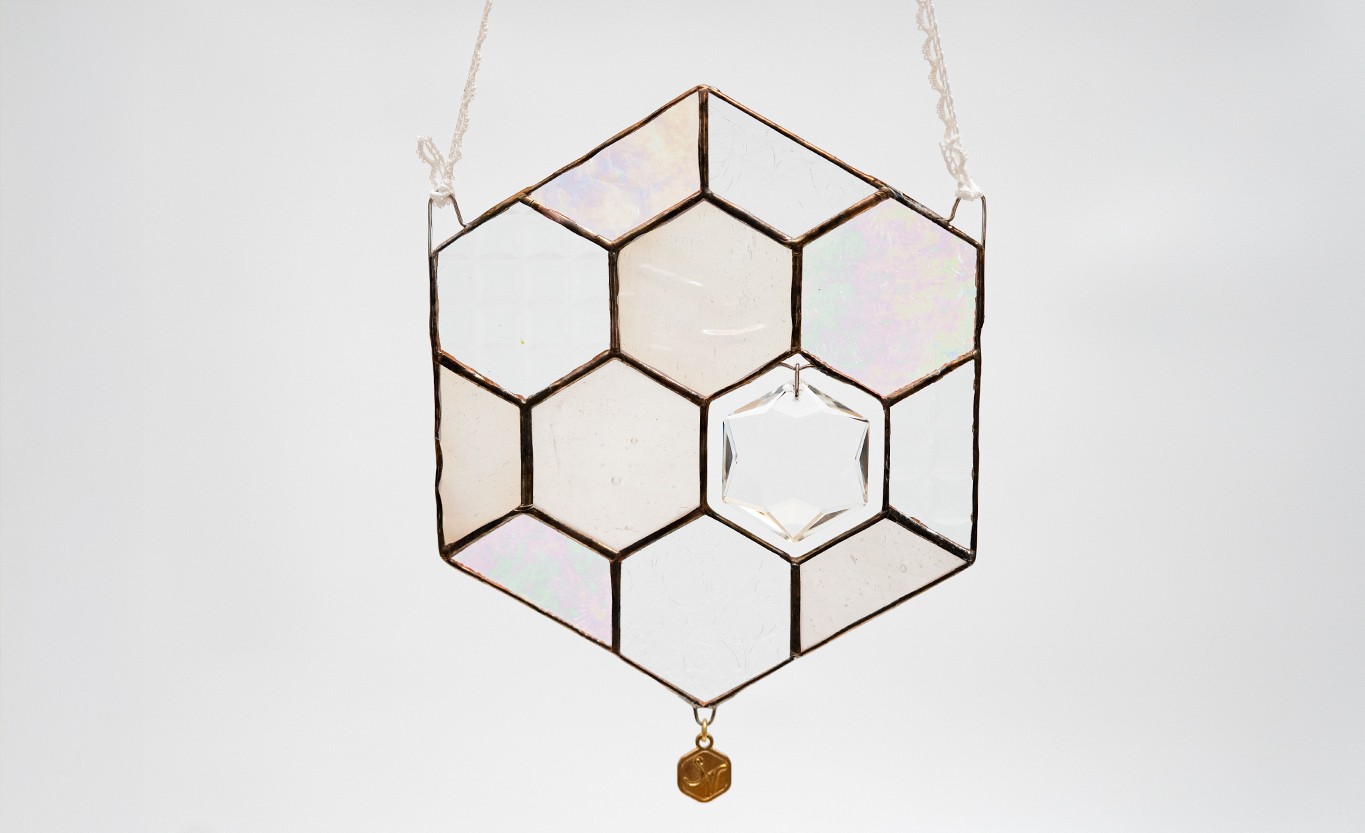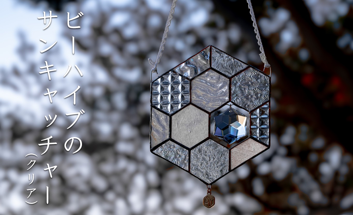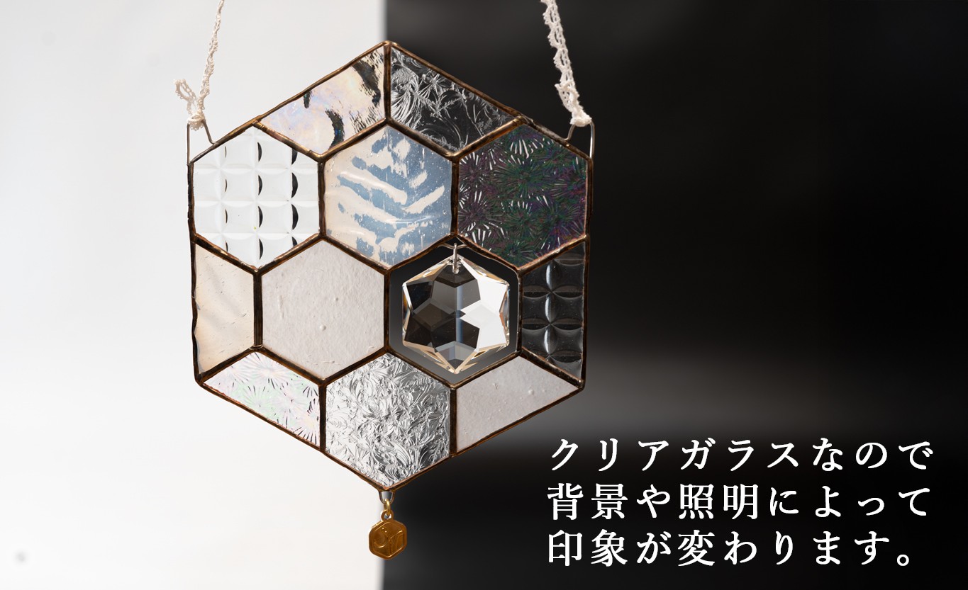 ステンドグラスの蜂の巣モチーフサンキャッチャー。クリアガラスの繊細な輝きが、雪の結晶を思わせる澄んだ美しさを演出します。クリスタルガラスが太陽の光をやさしく透かし、部屋中に光の粒を広げて幻想的な空間を演出。窓辺やお部屋のアクセントにぴったりです。引っ越し祝いや新生活の贈り物にも喜ばれるインテリア雑貨です。