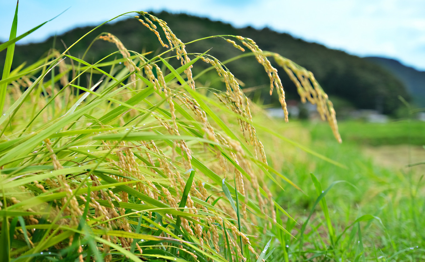 稲穂がみずみずしく育つとされる”瑞穂の國”三原村が誇るブランド米「水源のしずく」。