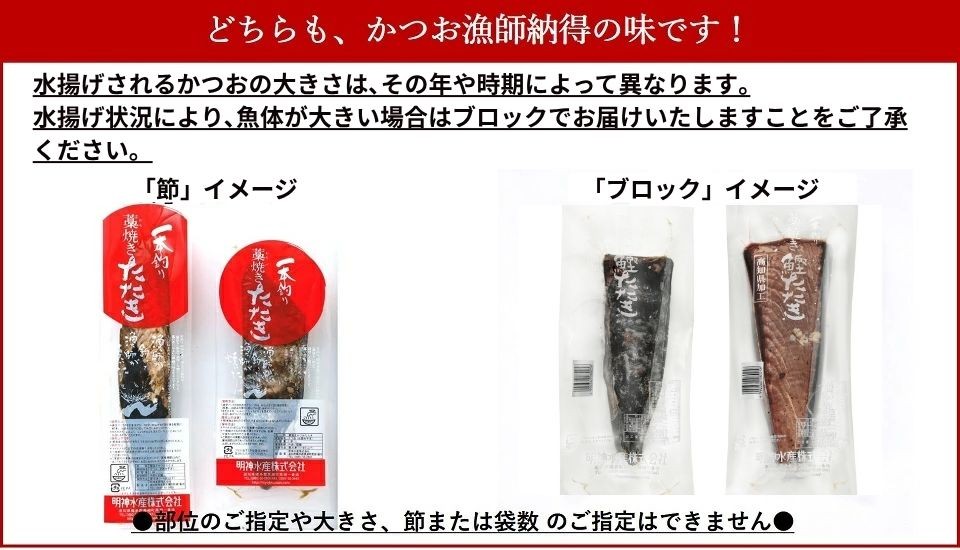 | 容量 | ◆内容量をお選びください◆ ・約500g ・約750g ・約1.0kg ・約1.5kg ・約2.0kg ・約3.0kg ◆定期便◆ 定期便回数および内容量をお選びください。 (定期便回数) ・【お申込みの翌月から2カ月連続でお届け】 ・【お申込みの翌月から3カ月連続でお届け】 (内容量) ※1回あたり ・藁焼き鰹たたき(合計約500g) ・藁焼き鰹たたき(合計約1kg) ※総重量で容量調整を行いますため、お届けする節やブロックの数、個体ごとの大きさは異なります。 ※部位の指定や節・ブロックの指定、大きさ・個数の指定はできません。 ※水揚げ状況により魚体が大きい場合は、節ではなくブロックでお届けいたします。 |