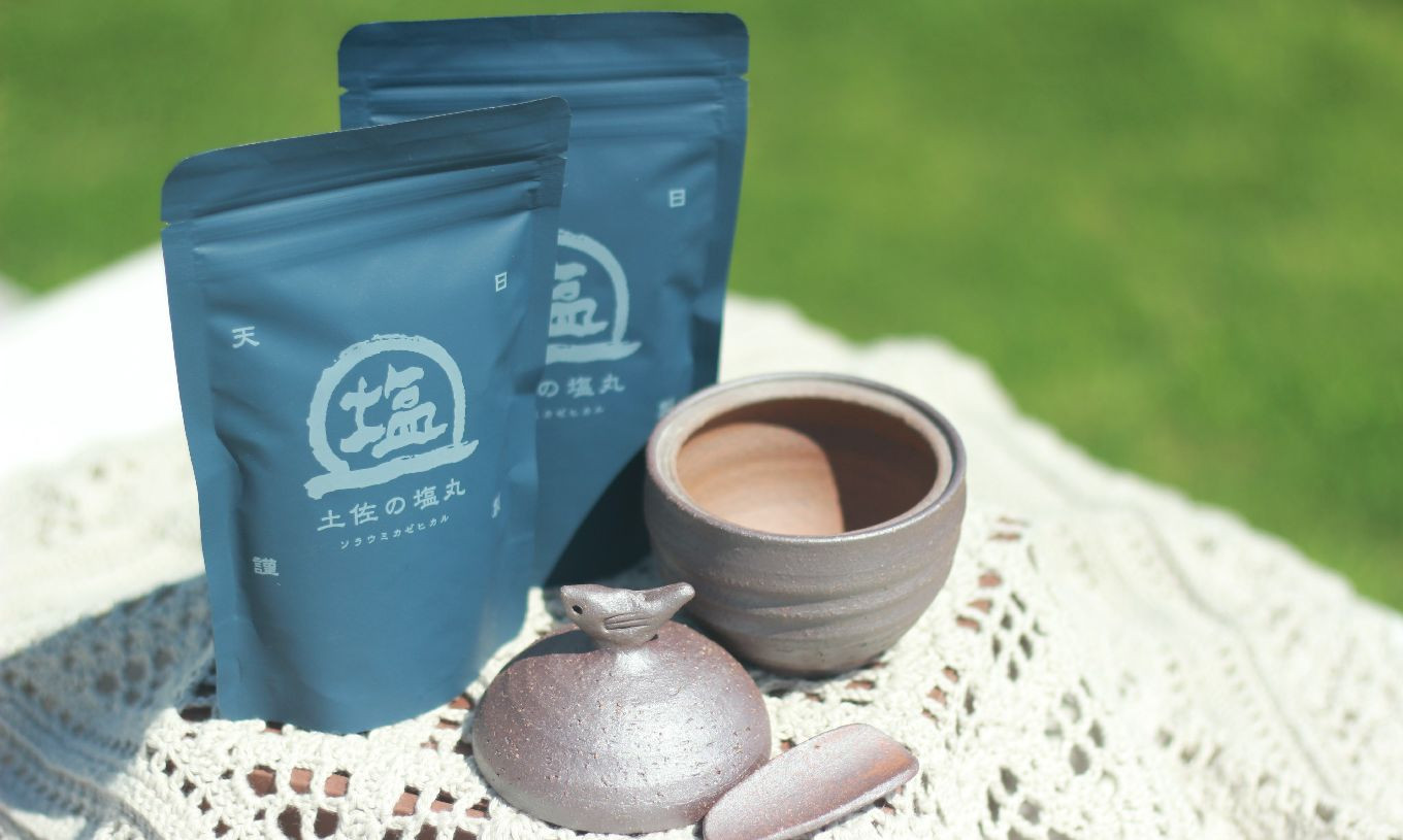 取っ手の部分を黒潮町の町鳥のシロチドリに仕立てた塩壷とお塩をすくうのに便利な塩さじ、そして天日海塩をセットにしました。