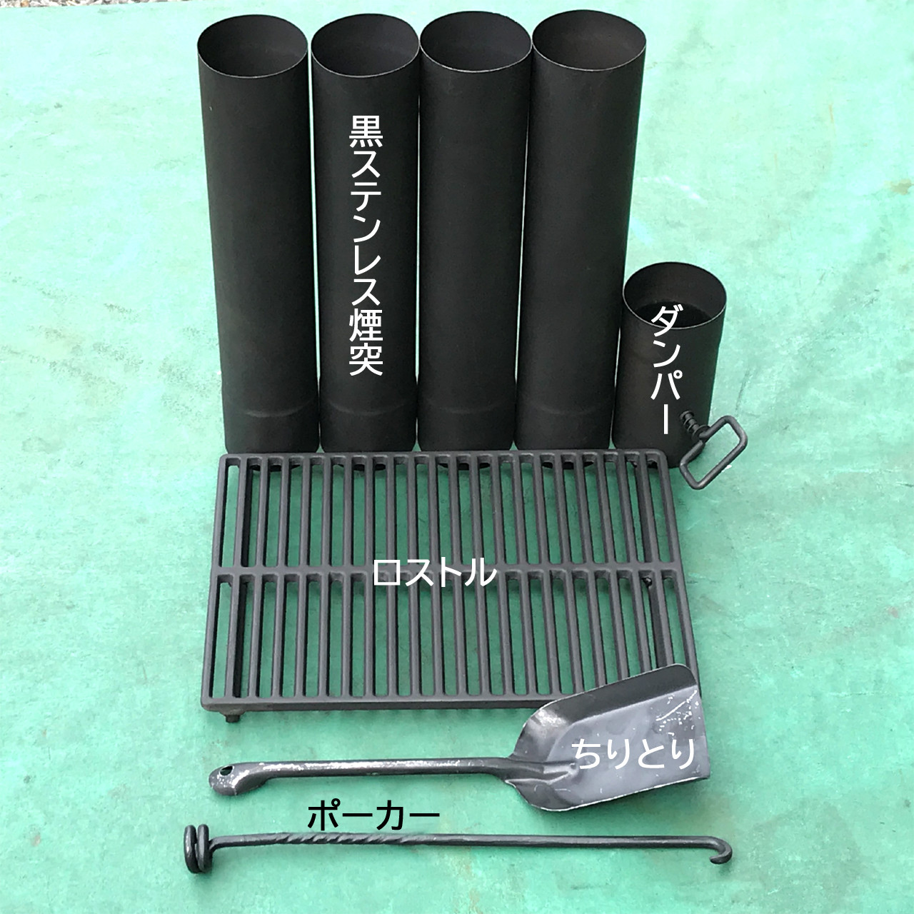 鉄板、付属品/黒ステンレス煙突・ダンパー・ロストル・ポーカー・ちりとり