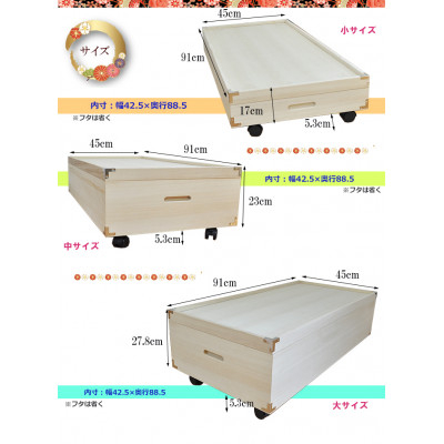 | 容量 | ■お礼品の内容について ・ふじ23cm[1点] 製造地:福岡県大川市 ■原材料・成分 【材質】総桐※底板・背板も全て桐となります。 【サイズ】本体:幅91cm×奥行き45cm×高さ23cm(フタ高さ:4cm)キャスター別途 【備考】完成品 |