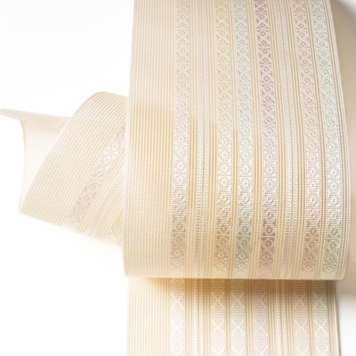博多織を代表する柄である、献上柄。江戸時代、筑前福岡藩の初代藩主によって博多織の反物や帯が江戸幕府へ献上されたことからこの名がつきました。仏具をモチーフにした独特の図柄は、鎌倉時代に博多織の原点となる織物を中国・宋から持ち帰った満田弥三右衛門が、共に宋へ渡った臨済宗の僧・聖一国師の助言を受けて考案したとされています。「透き通る伊達締めかすみ」の「華皿」をモチーフにした軽やかなストライプ文様には、いつでも着物を着る人の「おまもり」でありたい、という願いが込められています。