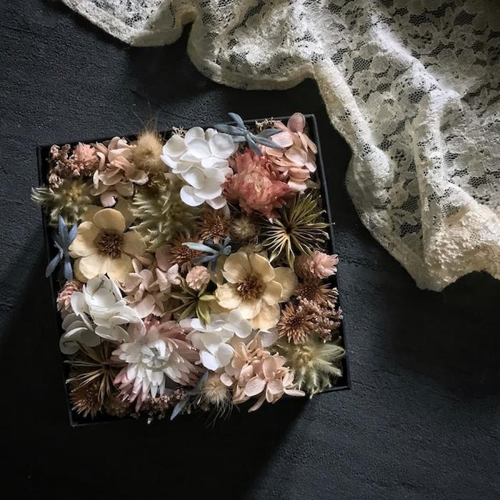 白色を中心としたドライフラワーやプリザーブドフラワーを詰め込んだフラワーボックス。