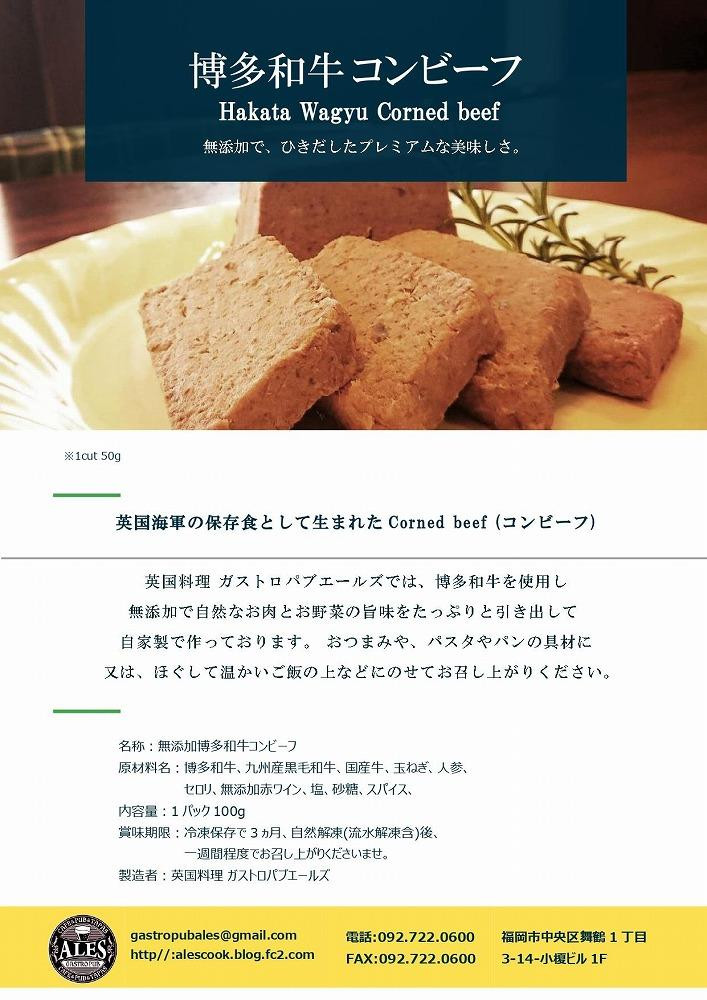 当店、英国料理ガストロパブエールズでは、博多和牛の第一人者博多和牛販売促進協議会堀田会長が造りだす、地球にやさしい循環農業由来の柔らかくジューシーな博多和牛をベースに厳選した三種類の牛肉をブレンドし自然な旨味たっぷりの無添加コンビーフを製造致しております。是非この機会にご賞味くださいませ。