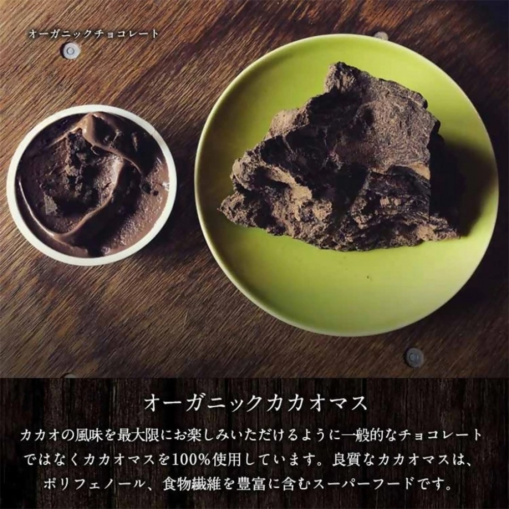 カカオの風味を最大限に引き出すために一般的なチョコレートではなくインドネシア産のオーガニックカカオマスを100%使用。良質なカカオマスはポリフェノール、食物繊維を豊富に含むスーパーフードです。