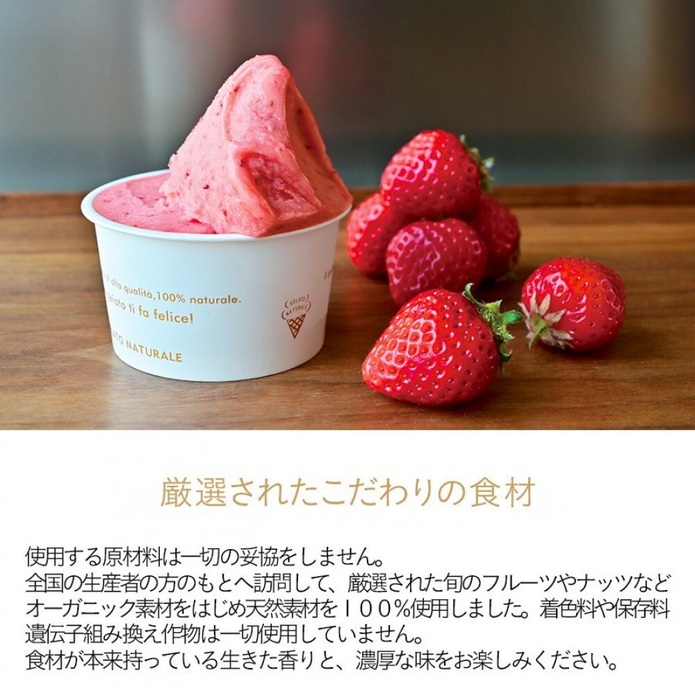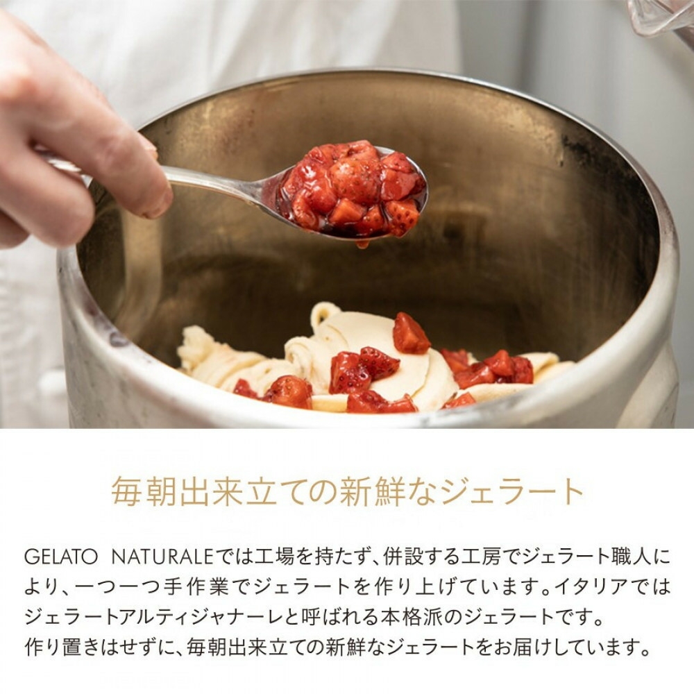 福岡市内の閑静な住宅街にあるジェラート専門店GELATO NATURALE。ローマのジェラテリア「Neve di Latte」で学んだイタリアの伝統的なジェラートをベースに、独自の製法で作られるオーガニックジェラートを提供しています。 GELATO NATURALEでは工場を持たず、併設する工房でジェラート職人により、一つ一つ手作業でジェラートを作り上げています。 イタリアではジェラートアルティジャナーレと呼ばれる本格派のジェラートです。作り置きはせずに、毎朝出来立ての新鮮なジェラートをお届けいたします。 使用する食材に一切の妥協をしません。福岡近郊の食材をはじめ、全国の生産者の方のもとへ訪問して、厳選された旬のフルーツやナッツなど、オーガニック素材をはじめ自然由来の素材を100%使用しました。 増粘剤や乳化剤、遺伝子組み換え作物は一切使用していません。食材が本来持っている生きた香りと、濃厚な味をお楽しみください。 ※アレルギーなどで食べられない味があれば、GELATO NATURALE(092-719-0017)までお電話にてご相談いただければ変更可能です。乳製品アレルギーの方もお楽しみいただける果物のみなど、乳製品不使用のフレーバーもご用意しております。 【製造地】福岡市東区水谷/GELATO NATURALE ジェラートナトゥラーレ 事業者名:GELATO NATURALE 連絡先:092-719-0017 ※画像はイメージです。