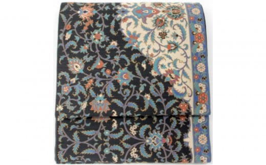 約7、000本もの経糸で色、柄を織り上げていく博多織らしさが一番表現されている帯地です。柄は正倉院名物柄を基調に唐草紋様を組み合わせ格調高い柄となっています。