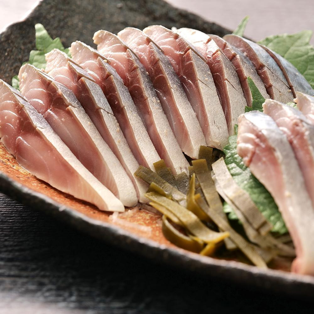 韓国の済州島沖で獲れた良質な脂の真さば、北海道道南産の真昆布、紀州和歌山産の梅干からとれた白梅酢など、素材にとことんこだわった鯵本舗にしかない〆鯖ができました。上質な脂と身質でしっとりとした食感をお楽しみいただけます