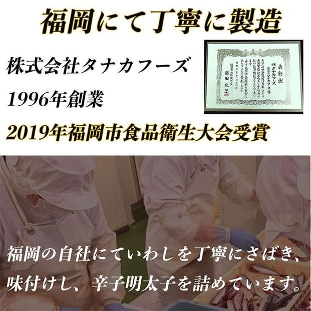 いわし明太子は脂の乗った鰯を明太子だれに漬けて味付けし、鰯の腹にたっぷりと明太子を詰めました。上質の明太子と脂の乗った鰯が絶妙に合わさった博多名物で、福岡のお土産として購入いただく方も多いです。いわし明太子は発売から20年以上が経つ、人気商品の一つです。いわし明太子は福岡にて熟練の職人が丁寧に作り上げております。本商品は化粧箱に詰めて発送となりますので、お歳暮、お中元や敬老の日などにもおすすめです。