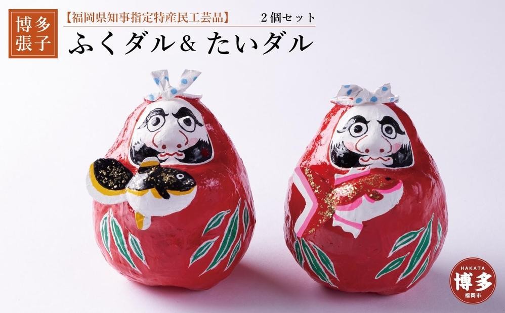 縁起物「鯛・ふく」を抱き、背には「にわか面」を付けて豆しぼりのダルマが「博多どんたく」を祝います。