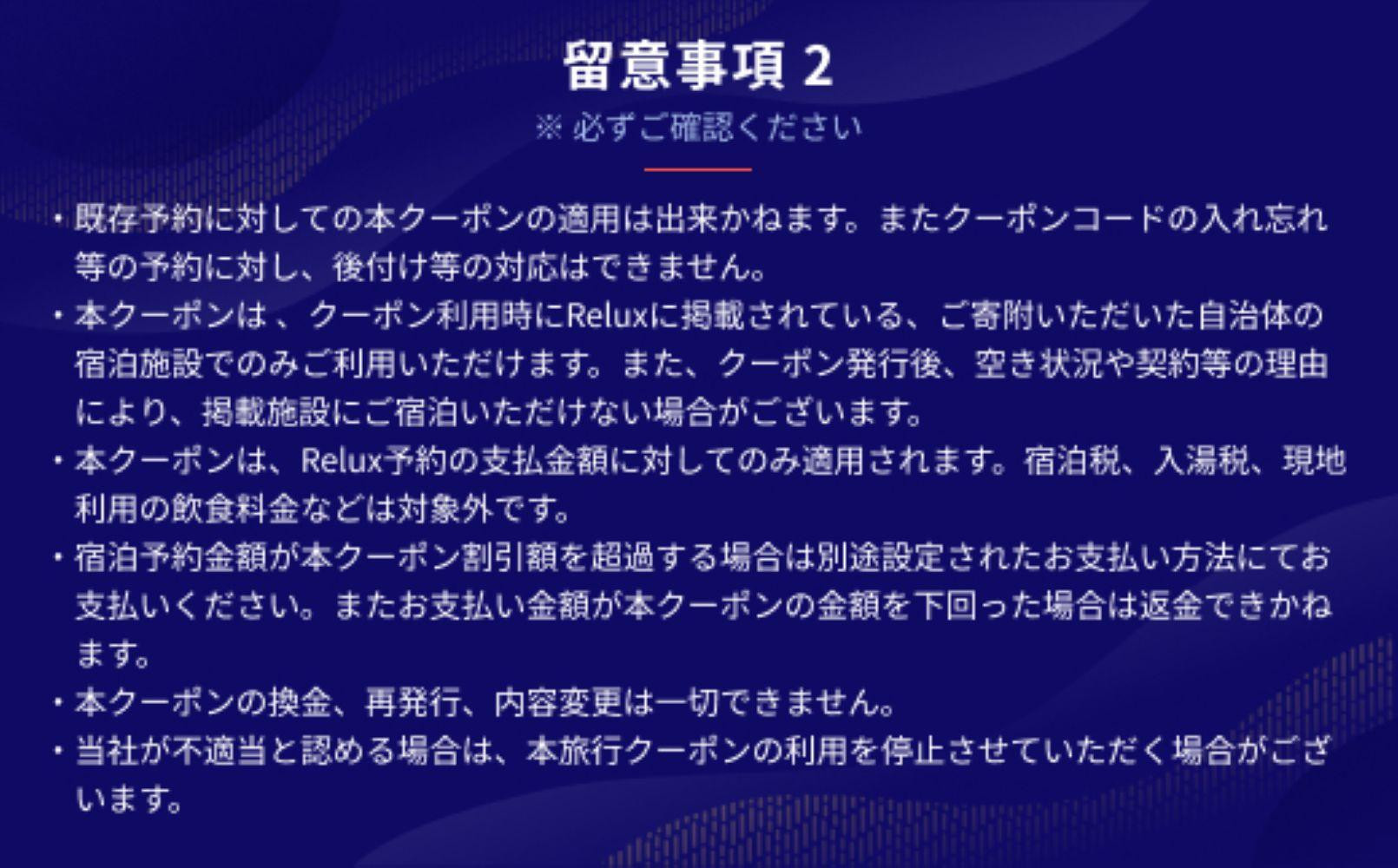 ・当社が不適当と認める場合は、本旅行クーポンの利用を停止させていただく場合がございます。