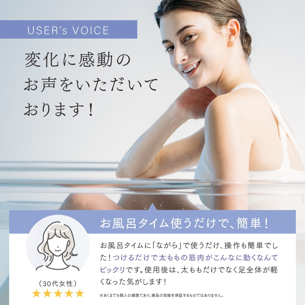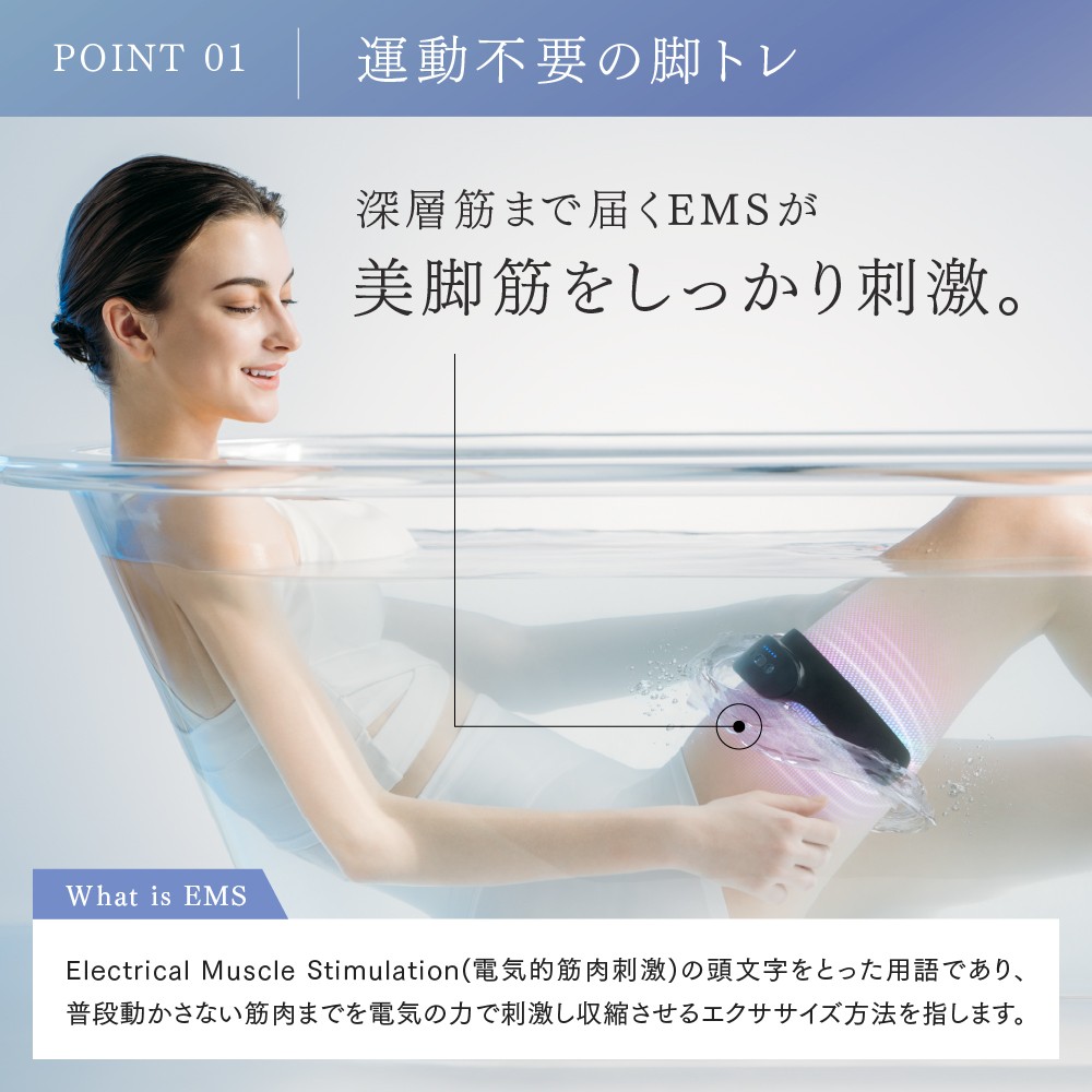お風呂だからこそ効率的に美脚筋を刺激し、独自のEMSプログラムと製品設計で、360°全方向から「ながら」トレーニングを叶えます。