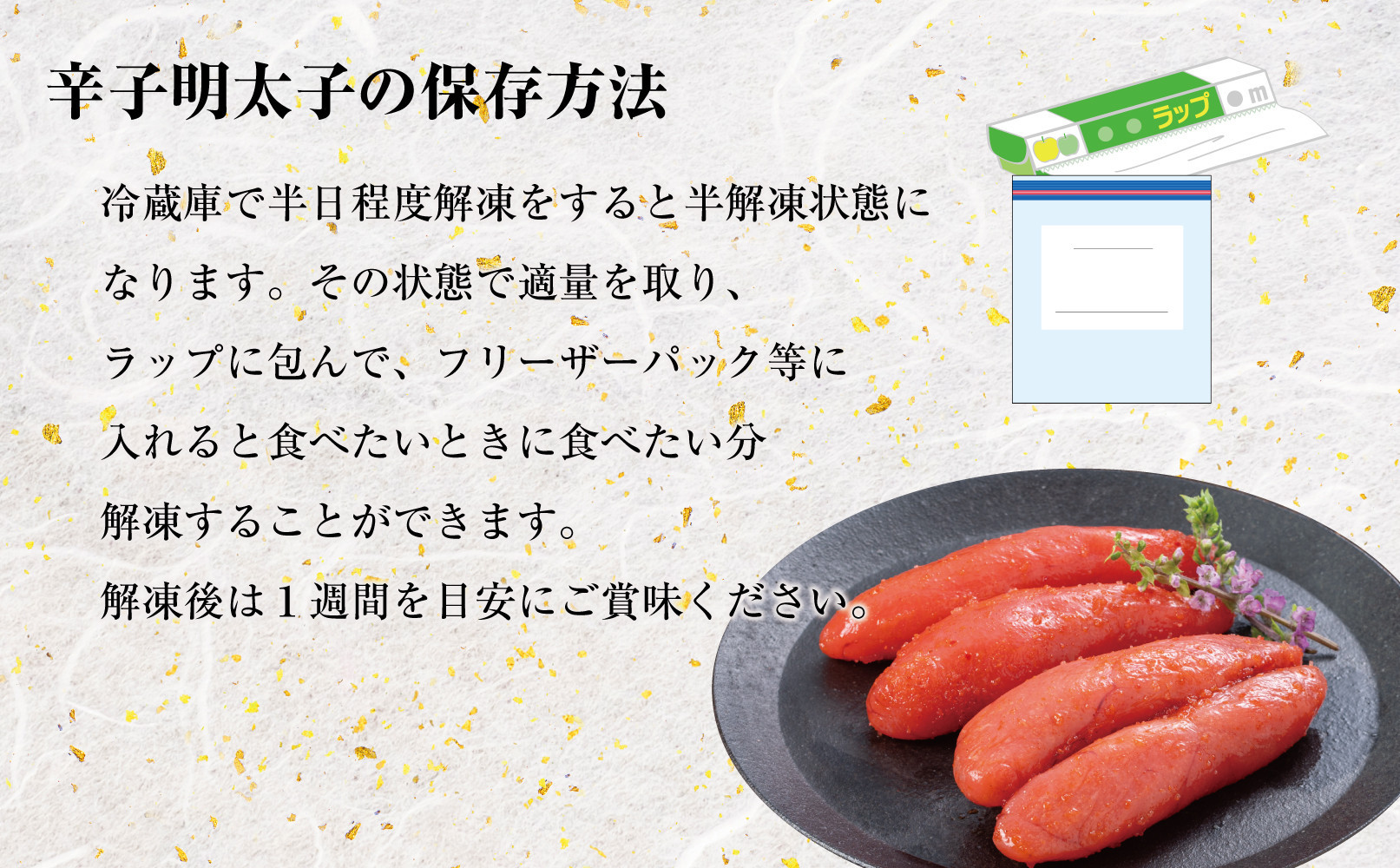 | 容量 | 辛子明太子 1kg 原産国:ロシア又はアメリカ産 製造国:日本 産地(都道府県):福岡 |