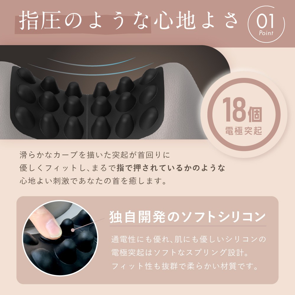 物足りないを解消する EMS×温熱×指圧。最高の癒しを追求しました。 寝るだけで整うケア さまざまなシーンで大活躍。おやすみ前に、休憩時間に、リラックスタイムに。 じんわり癒しながら首を労わる至福の時間を 肌に優しい電極突起で指圧の様な心地よさ 独自開発のEMS技術が筋肉深層にアプローチ 2パターンの加熱でじんわり温感ケア 工学博士考案の厳密なカーブ設計 2Way向きを変えて2つの使い方 ゆったりストレッチ。/しっかりストレッチ。 コードレス仕様 コードレスなので場所を選ばずどこでもケアできます。座りながらのケアも可能。 事業者名:日創プラス 関連キーワード:ネックケア NIPLUX ニップラックス EMS 温熱 指圧 3Dカーブ コードレス 首ケア 肩こり 疲れリセット 美容家電 健康家電 在宅ケア 自宅ケア 家電 マッサージ マッサージ機 マッサージ機器 マッサージャー 日用品 送料無料 ギフト 静音 日創プラス ホームケア 自宅美容 家電製品 電化製品 ※画像はイメージです。 ※入金確認後、2週間以内を目途に発送いたします。 ※受注状況により、お待たせする場合がございます。