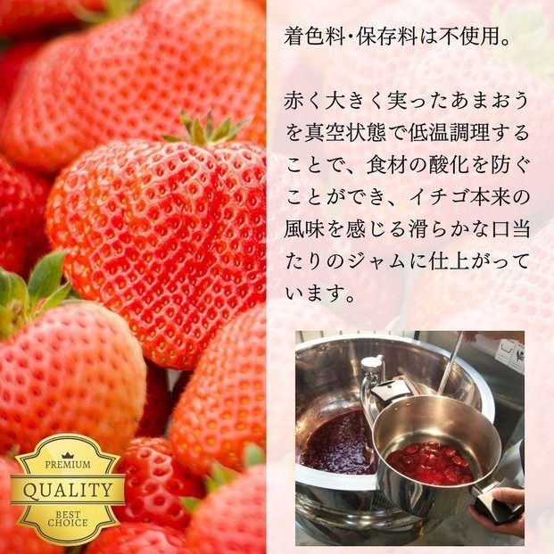 農業の6次産業化の取り組みとして、開発した商品。製造過程にこだわっており、真空状態で低温調理することによりイチゴ本来の風味を残しつつ、食材の酸化を抑えることでなめらかな口当たりに仕上がっています。あまおうを贅沢に使用したいちごジャムです。