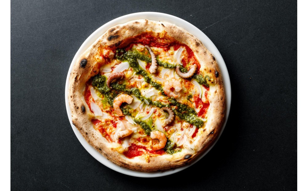 海鮮トマトバジルは、トマトの旨味と魚介の旨味の相乗効果を感じられる、定番の大人気ピザ。