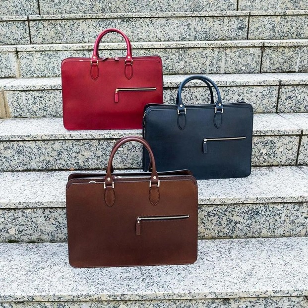 カラーはダークブラウン、ボルドーレッド、ブルーブラックの3色。ダークブラウンとブルーブラックはファスナーなど金具の色がシルバーを使用し、シックで落ち着いた雰囲気に。 ボルドーレッドはゴールドを使用し華やかなイメージを与えてくれます。パッと目がいく個性的なカラーです。機能性と収納力に長けた最強の相棒でメインコンパートメントは、A4ファイルも余裕をもってすっきりと入ります。ペンケースやガジェットポーチなどビジネスで必要なものが入ります。前面と後面にはオープンポケットがあり、さっと出し入れしたい書類などを分けて入れておくこともできます。中には長財布も収納できるよう大きめのオープンポケット。隣にはB6くらいの手帳が入るサイズのオープンポケットを用意しました。ファスナーポケット側にも、名刺入れやパスケースが入る小さめのオープンポケット。 ファスナーポケットで貴重品もしっかりガード。小物を分けて収納できるので、自然と整うビジネスバッグです。着脱・長さ調整可能なショルダーベルトもついています。出張でキャリーケースなど他に荷物がある場合にも、肩がけする事で移動もしやすくなります。