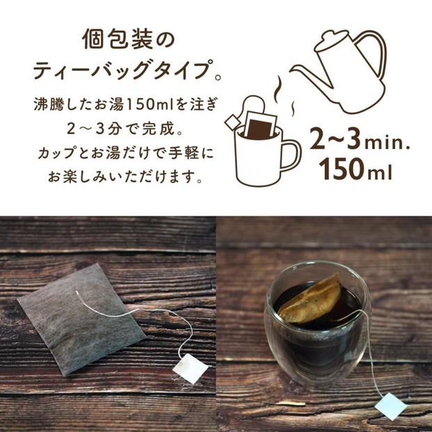 ティーバッグ形式なので、一切の面倒なく、お湯とカップさえあれば、どこでも淹れることができます。コーヒーバッグとはとても思えない美味しさにきっと驚かれる事でしょう。