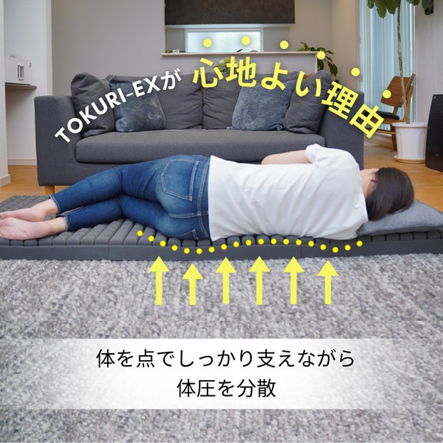 「TOKURI-EX コンパクトマットレス」は、厚さ約8cmでしっかり体を支えながらも、折りたたんで省スペースに収納できる設計。内部には高反発ウレタンを3D立体構造に加工し、体圧を広く分散。寝返りも打ちやすく、翌朝の目覚めが変わります。