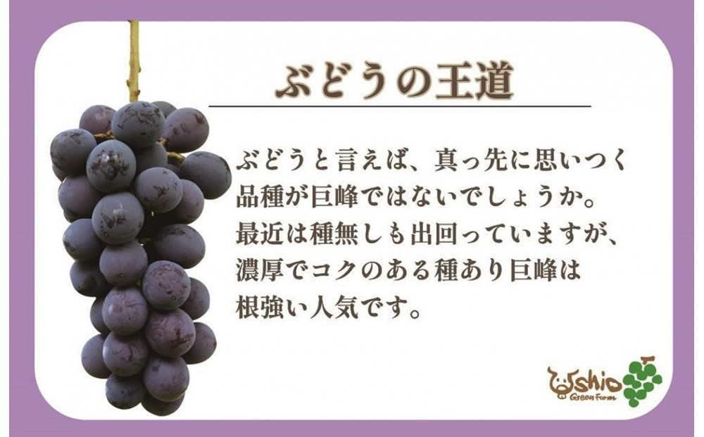| 容量 | 福岡市産巨峰 ・約2000g(5房前後) ブドウの品種:巨峰 種の有無:種あり 原産国/製造国:日本 |