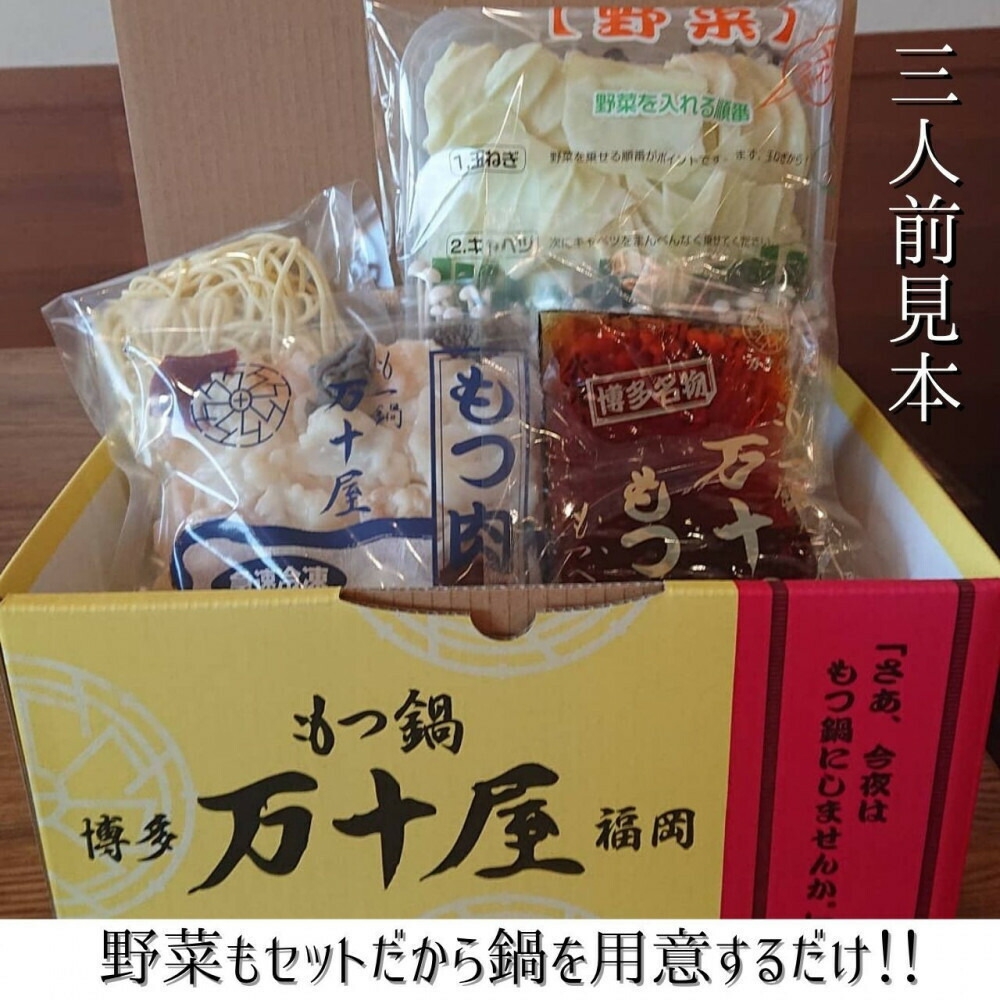 創業70余年!戦後から福岡で愛される「もつ鍋万十屋」のもつ鍋セット3人前です。 万十屋のもつ鍋はもつ鍋発祥の店として代々「タレで作るすき焼き風もつ鍋」の味を守っており、他とは一風変わったもつ鍋になります。 もつ(4種類のミックス)お野菜(キャベツ・たまねぎ・えのき・ニラ)秘伝タレ・チャンポン麺を全てセットにしての販売をしていますので、届いたらすぐに調理していただけるようになっております。 また、自社でもつをしっかりと洗い、臭みを取る加工をしておりますのでもつの臭味が苦手な方にも食べて頂ける自信があります! 解凍したお肉は水洗い、下茹で等せずにそのまま使用してください。 4種類のミックスもつにお野菜と甘辛い秘伝タレで作るスタミナ満点の万十屋もつ鍋! 〆はちゃんぽんで! ご飯と卵でビビンバ飯にしていただいても! 是非いかがでしょうか!! 【製造場所】 福岡県福岡市早良区田村1-12-10 事業者名:もつ鍋 万十屋 連絡先:0120-325-018 ※画像はイメージです。 ※賞味期限:製造日より6日【保存方法】冷蔵庫にて 保存してください ※1月3日から6日の着日指定は賞味期限と店休日の都合によりお受けできません。 ※発送前の事前連絡は行っておりません。長期不在がある場合は、お申し込み時にお知らせください。また、日中連絡が取れる連絡先のご記入をお願い致します。 ※お届け先のご都合(連絡なしの長期不在や転居・住所間違い等)で返送された場合は、返礼品の再送は致しません。