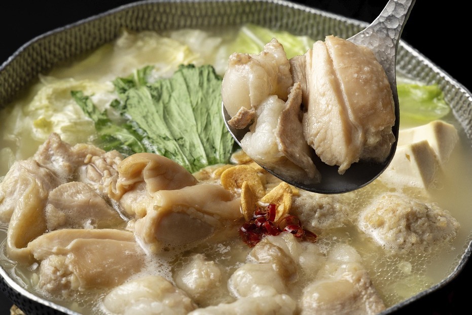 水炊きスープ仕立ての、水炊きともつ鍋のハイブリッド鍋で絶妙なバランスをお楽しみいただけます。