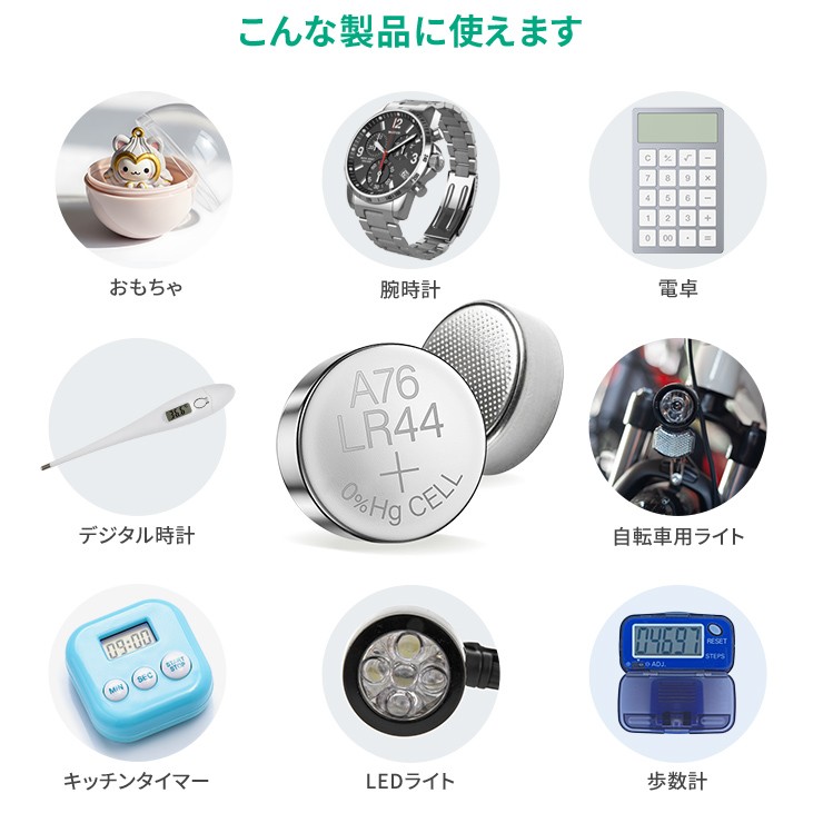 時計、電卓、小型電子ゲーム、電子体温計、キーレスエントリー(車載用機器)、電子手帳、LEDライトなど、様々な小型機器に用いられているボタン電池、ストックしておけば、急な電池切れでも慌てることはありません!