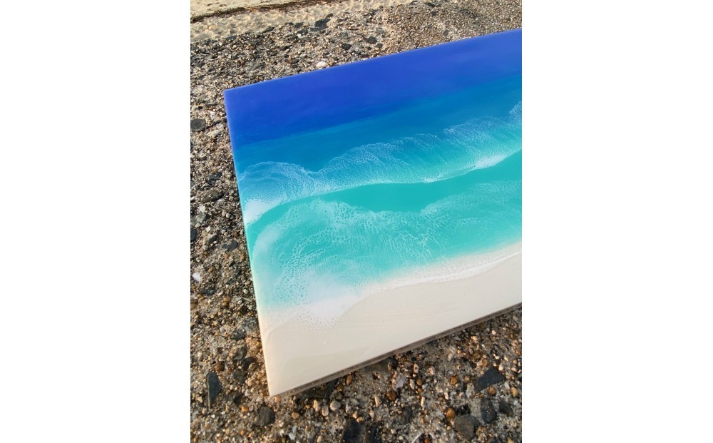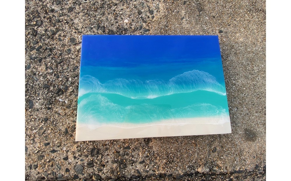 色を塗ったパネルにエポキシレジンを重ねていきます。白のレジンで線を引きヒートガンをあてて波の模様を描いていきます。1日程度乾かして固めたのちまた波を描き層を重ねていきます。