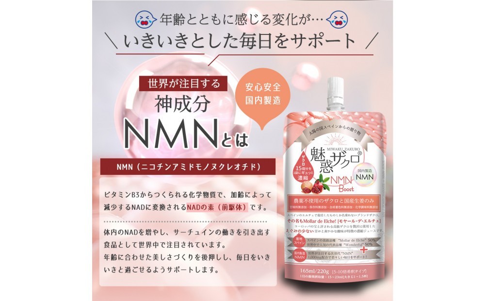 | 容量 | 魅惑ザクロ NMN Boost ・12袋(165ml×12) |