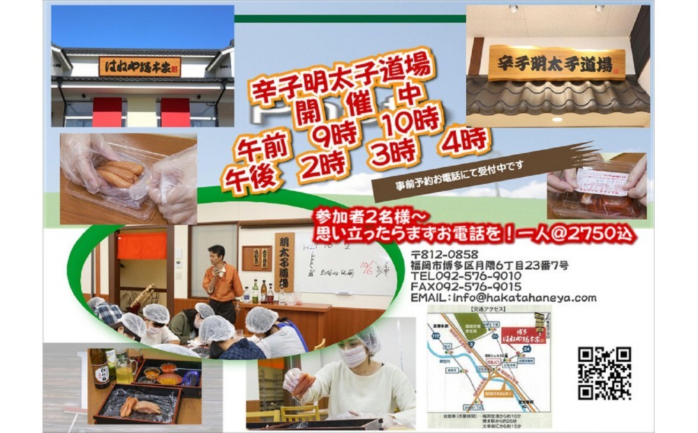 | 容量 | 明太子道場(オリジナル明太子漬込み体験)3名様分 1セット当たり132g×3名様分 漬込みした明太子を持ち帰りされる方は常温で12時間は持ち運び可。その後は、必ず冷蔵保存をお願します。 配送を希望される方はクール便にて対応。 |